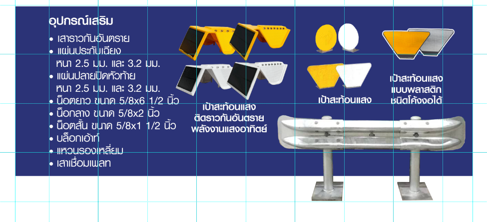 - ราวกันอันตราย / ราวเหล็กลูกฟูก วัสดุทำจากเหล็กชุบกัลวาไนซ์ ตามมาตรญานของกรมทางหลวง และกรมทางหลวงชนบท ช่วยกั้นบริเวณขอบถนน จุดเสี่ยง ทางลาดชัน หรือทางโค้ง