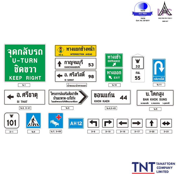 • ขนาดป้าย สัญลักษณ์ และตัวอักษร เป็นไปตามข้อกำหนดของกรมทางหลวง